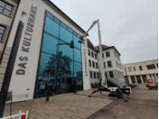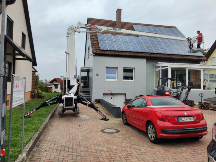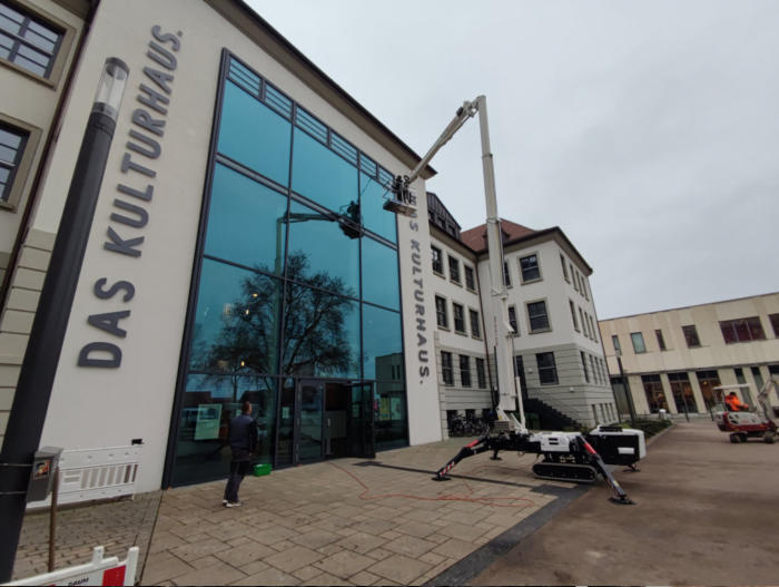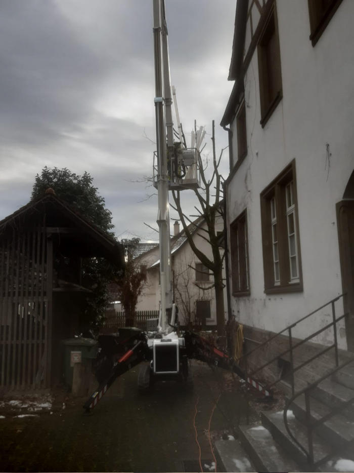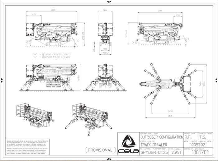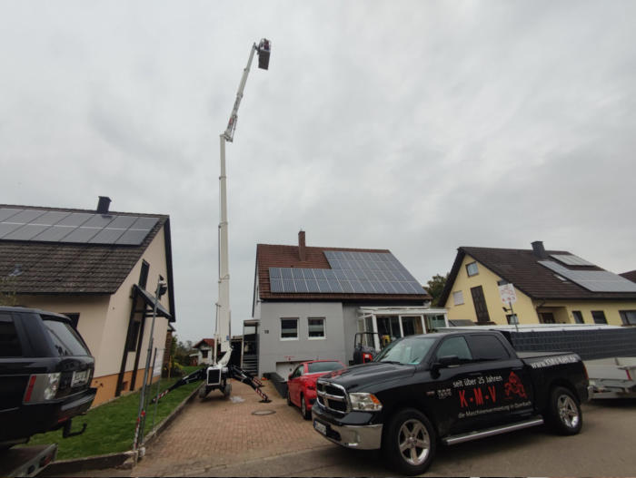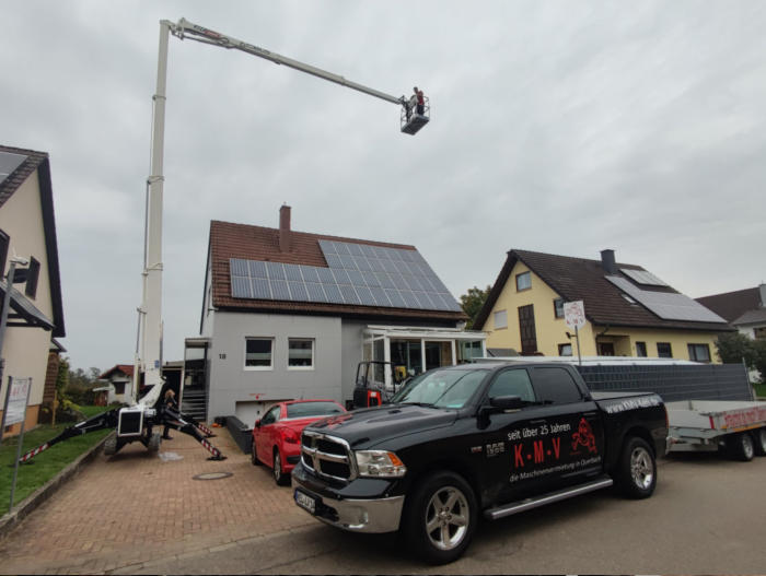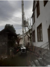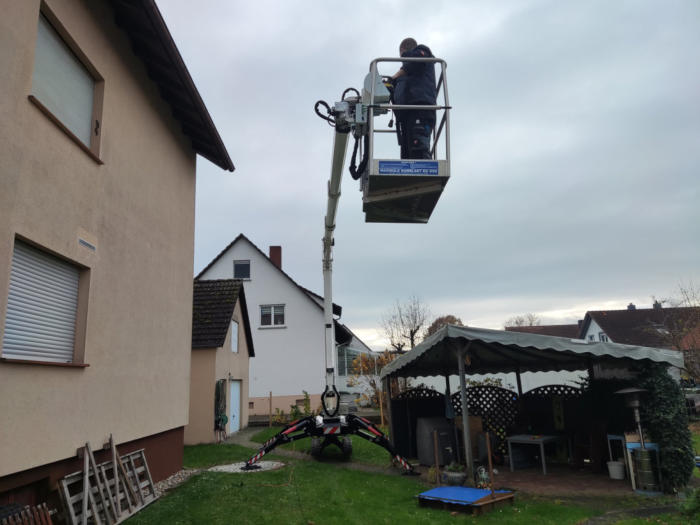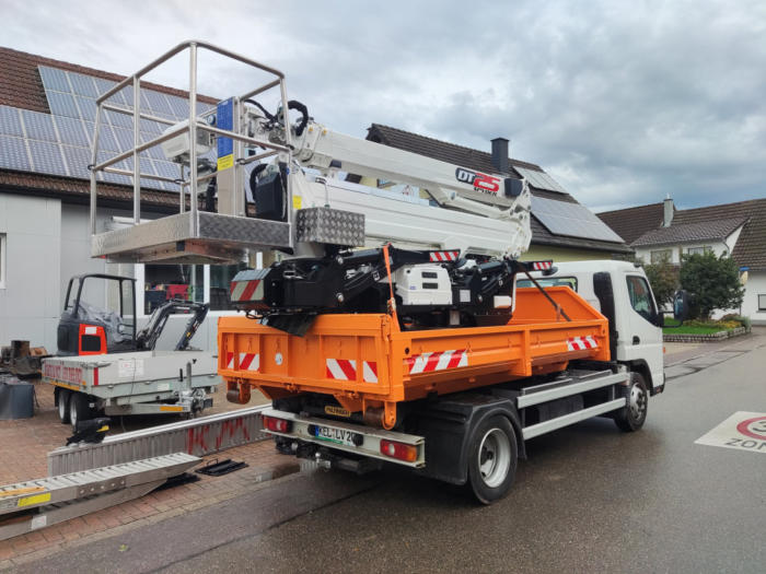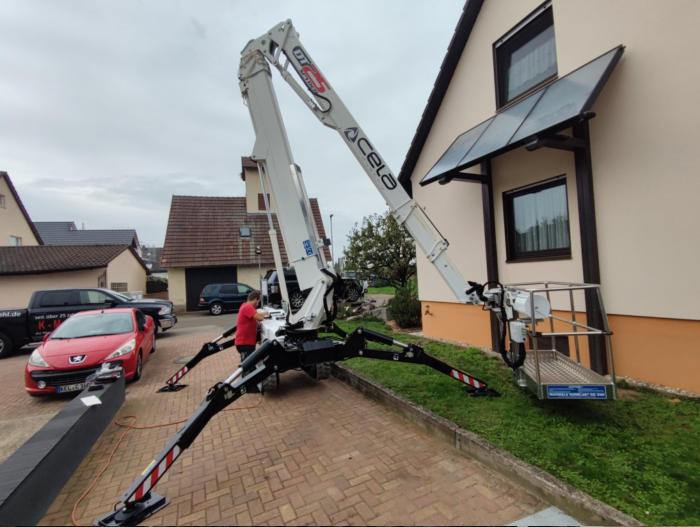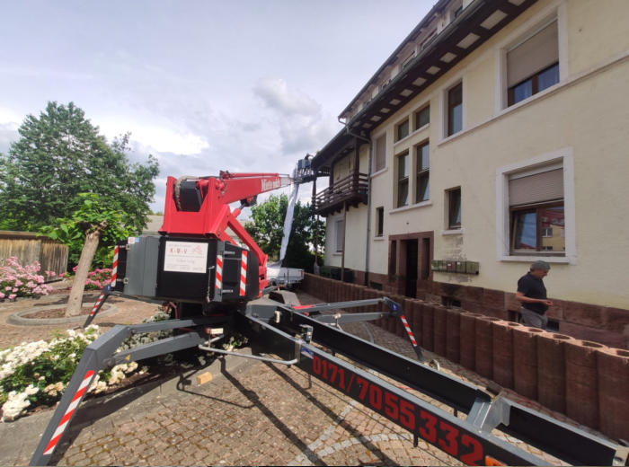 Raupenarbeitsbühne Arbeitshöhe 25 m seitliche Auslage 12 m minimale Abstützbreite 2,8 m Durchfahrtshöhe 1,98 m Durchfahrtsbreite 83 cm